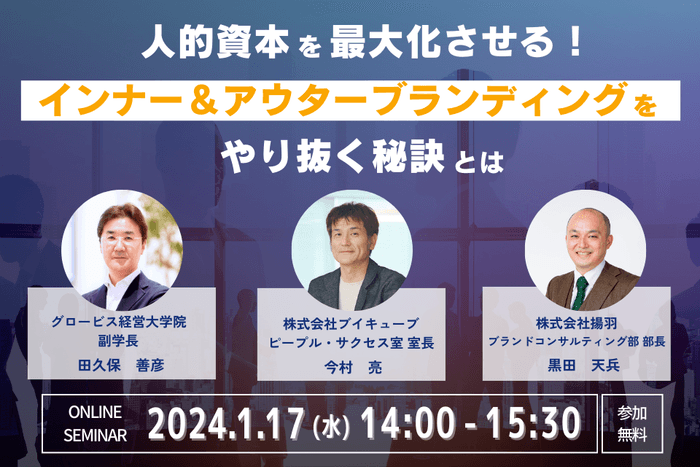 コーポレートブランディング支援を行う株式会社揚羽(東京都中央区 代表取締役社長 湊剛宏 以下、弊社)は、2024年1月17日(水)に、グロービス経営大学院 副学長 田久保善彦氏と株式会社ブイキューブ ピープル・サクセス室 室長 今村亮氏をゲストスピーカーに迎え、「人的資本を最大化させる!インナー&アウターブランディングをやり抜く秘訣とは」と題したセミナーを開催いたします。