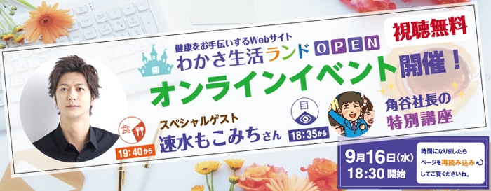 【参加無料】リニューアルを記念して、特別ゲストに速水もこみちさんをお迎えし、健康に関するオンラインイベントを開催