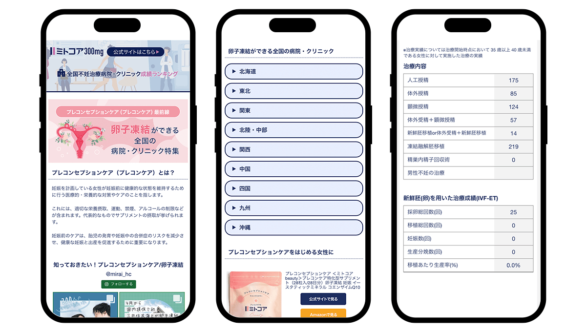 プレコンケア特化型サプリメント「ミトコアBeauty」を提供する株式会社未来ヘルスケア(大阪市中央区)は、卵子凍結ができる全国の病院・クリニック特集を当社ホームページに2024年4月10日(水)、公開しました。