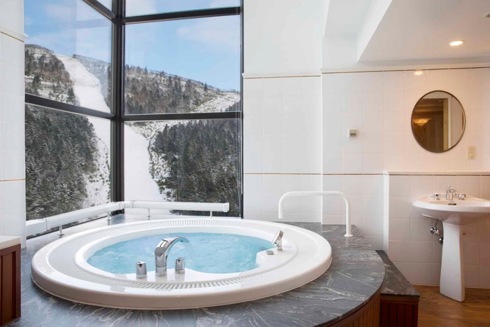 ホテルの28階に位置し、大きな窓から山々の広大な景色を味わえる「デザインスイートツイン」。大自然を見渡せる展望ジェットバスやデザイン性と機能性に富んだリビングスペースを備えた、ゆったりと寛げる100平米の客室です。ほっと温まるウェルカムドリンクのルームサービスで、移動の疲れをリフレッシュできます。