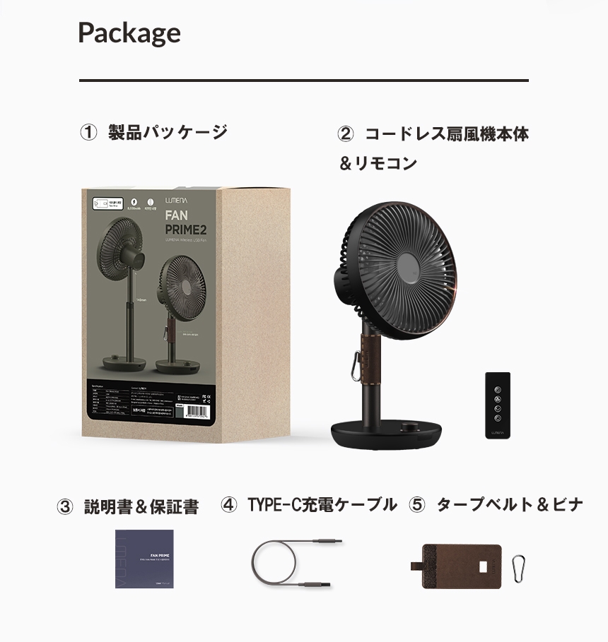 内容 : 「FAN PRIME2」本体、リモコン、充電コード、