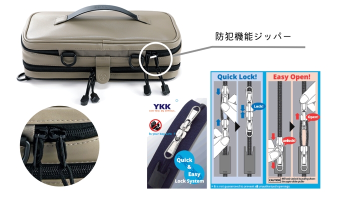 さらに採用しているジッパーはYKKのQuick&Easy Lock System Zipper。開け方の法則を知らない人には開けづらい為、防犯性も高く使用者は片手で簡単に開けることができるのでとても利便性の高いジッパーです。