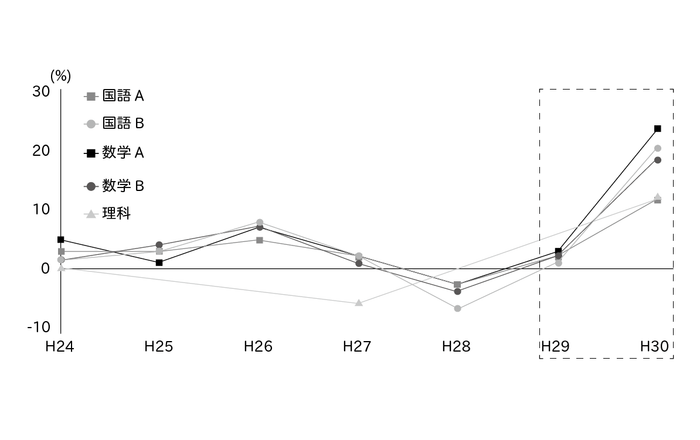 図1 :文京区立文林中学校における全国学力・学習状況調査の推移(全国平均値を0としたときの正答率の差)。転線枠内がプレゼン授業を導入した年の結果。
