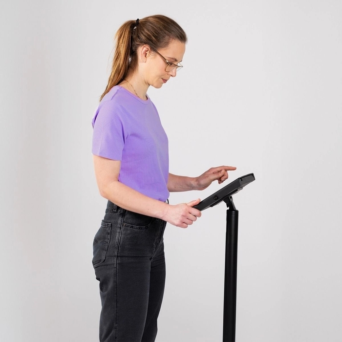 「VESAフロアスタンド – Swift」は、自立型のポータブルスタンドとしても、床に固定して使用するスタンドとしても活用できる、シンプルで実用的な業務用フロアスタンドです。レストラン、ショップ、ホテル、オフィス、会議室など、さまざまなシーンでiPad、Surface Pro/Go、その他のタブレットやモニターをスマートにご利用いただけます。