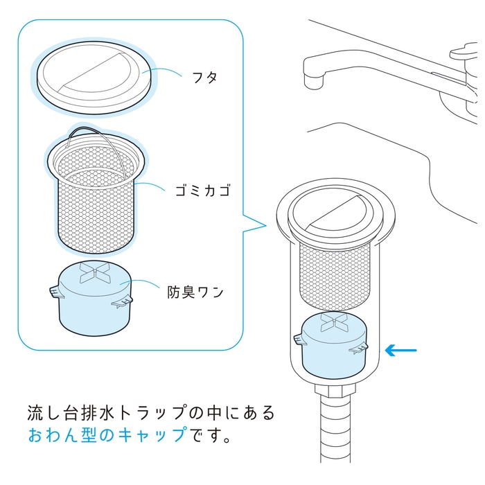 ところで防臭ワンとは、キッチン流し台の「フタ」「ゴミカゴ」の下にある「おわん型のキャップ」のことです。