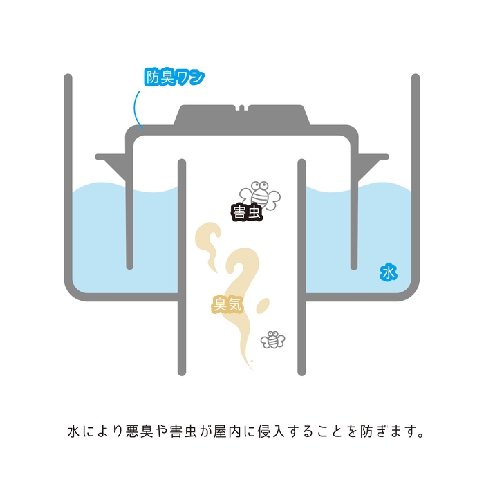 防臭ワンの役割は、排水管からの「悪臭」や「害虫」が上がって屋内などに侵入してくるのを防ぎます。