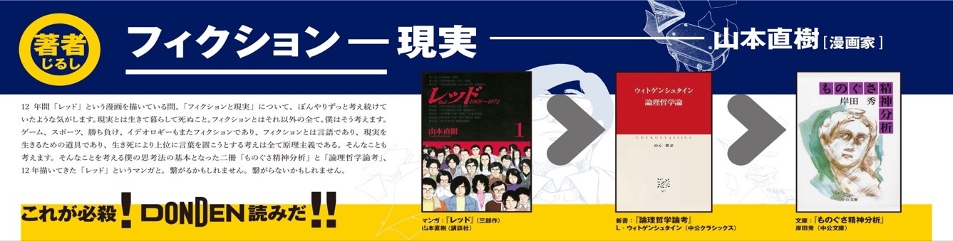 「DONDENフェス」は、マンガ・新書・文庫を三冊セットで読む「DONDEN読み」を主軸にしたブックイベントとして、これまでに、漫画家の近藤 ようこ氏、山本 直樹氏、批評家の永山 薫氏をお呼びし、編集工学研究所のブックサロンスペース「本楼」で開催してきました。今回はじめて、DONDENの本拠地である近畿大学アカデミックシアターで開催いたします。以下は、過去のDONDENフェスでの「DONDEN読み」の例です。