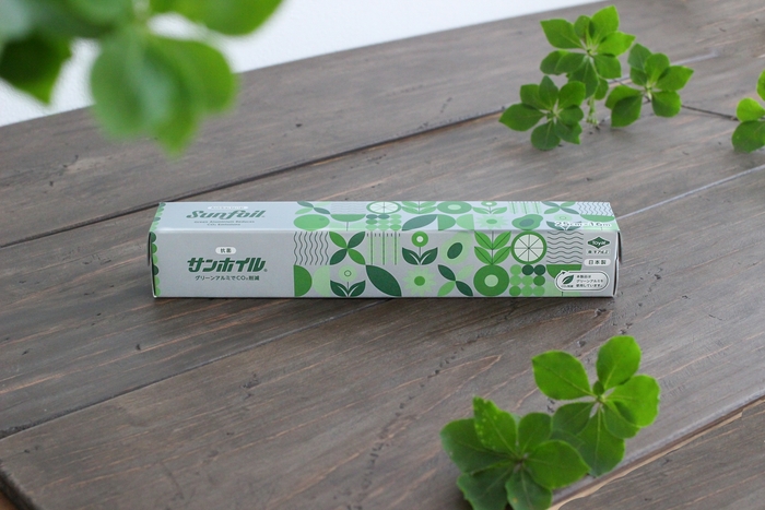 伝統的なシルバーカラーを基調としながら、ボタニカルパターンを採用することで、私たちの環境への取り組みを表現しています。毎日の調理や生活の中で使用されるアルミホイルなので、パッケージ素材まで環境へ配慮したものを選定、CO2削減に貢献し、持続可能な環境保全へつなげたいと思います。サンホイルを選ぶことは、地球環境への優しい選択であり、消費者一人ひとりの環境保全活動になるといえます。