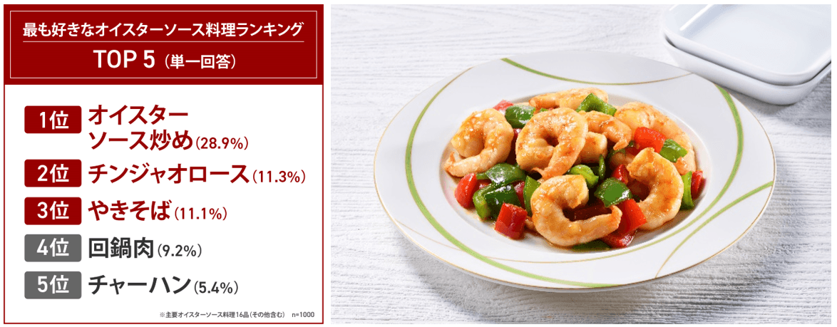さらに、オイスターソースを使った好きな料理を質問したところ、1位は「オイスターソース炒め(28.9%)」、2位は「チンジャオロース(11.3%)」となりました。さまざまな食材に合い、アレンジが可能なオイスターソース炒めは中華料理において人気メニューであることが明らかになりました。