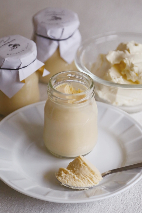 今回販売開始する生チーズケーキは、洋菓子づくりのノウハウに和菓子づくりの技術を応用して取り入れ、幾度も試作を重ねて独自の製法を考案。ベイクでもレアでもない“生”の滑らかな食感が味わえる新たなスタイルのチーズケーキを瓶に詰めました。そのままで味わうだけでなく、ディップとしてパンやスコーン、クラッカーなどにつけても美味しく召し上がれます。能登産の卵とフランス産チーズに、素焚糖とグラスフェッドバターを使用。素材にもこだわりました。