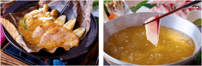 併せてお楽しみいただけるのは飛騨の郷土料理。テーブルで銘々に焼きあげる朴葉味噌焼きは、豚トロで。豚の脂身と味噌が双方の美味しさを引きたてます。ご飯も飛騨の銘酒も進む一品です。岐阜県・白川町で生産される「白川茶」を煮出した出汁でお楽しみいただくのは「黒瀬ぶりのしゃぶしゃぶ」。ぶりの脂のくどさを感じさせない、あったかメニューです。