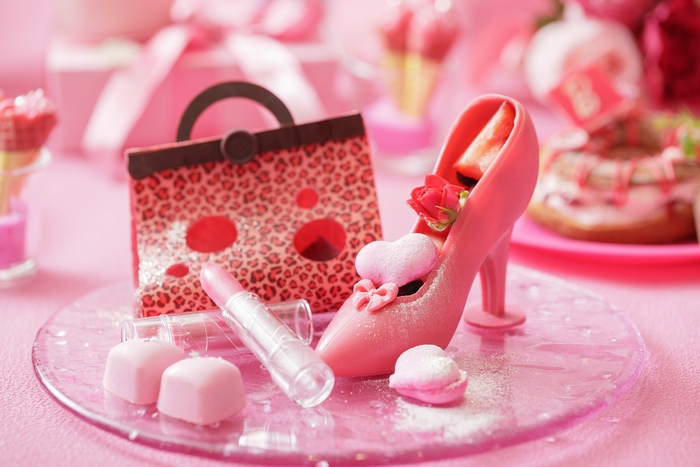 とろける甘さのハイヒール ストロベリー&チョコ ホットミルク添え / スペシャリティーバッグ / ジュエルに見立てたパートドフリュイ(イチゴ・ラズベリー) / ハートマカロン / リップスティック / ベリーボンボンショコラ / ラズベリーパリブレスト