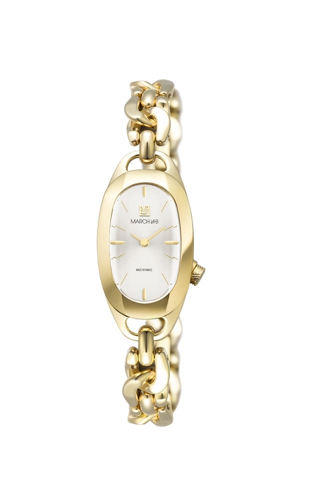 「オブロング」のダイヤルは、洗練されたミニマリズムを体現しています。シンプルでありながら、優雅さを極めたデザインは、March LA.Bの哲学を反映しています。中央には、さりげなくMロゴが配置され、スリムな針がダイヤル全体のバランスを引き立てています。ブレスレットには、ケースと同色のチェーンタイプを採用。時計との一体感を高め、より洗練された印象を演出します。スイス製の高精度クォーツムーブメントを搭載し電子振動によって正確な時を刻みます。温度変化に応じて振動数を調整するシステムを備えており、どんな環境でも安定した精度を維持します。また、長寿命のバッテリーシステムを採用し、約60ヶ月の駆動を実現。電池残量が少なくなると、秒針が4秒ごとにジャンプする「EOL(End of Life)」機能を搭載し、バッテリー交換のタイミングを知らせてくれます。