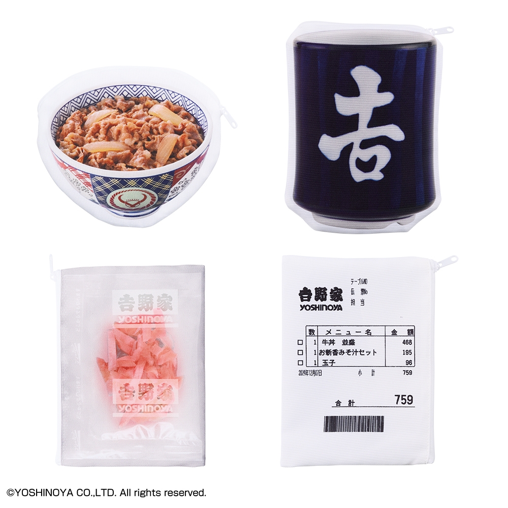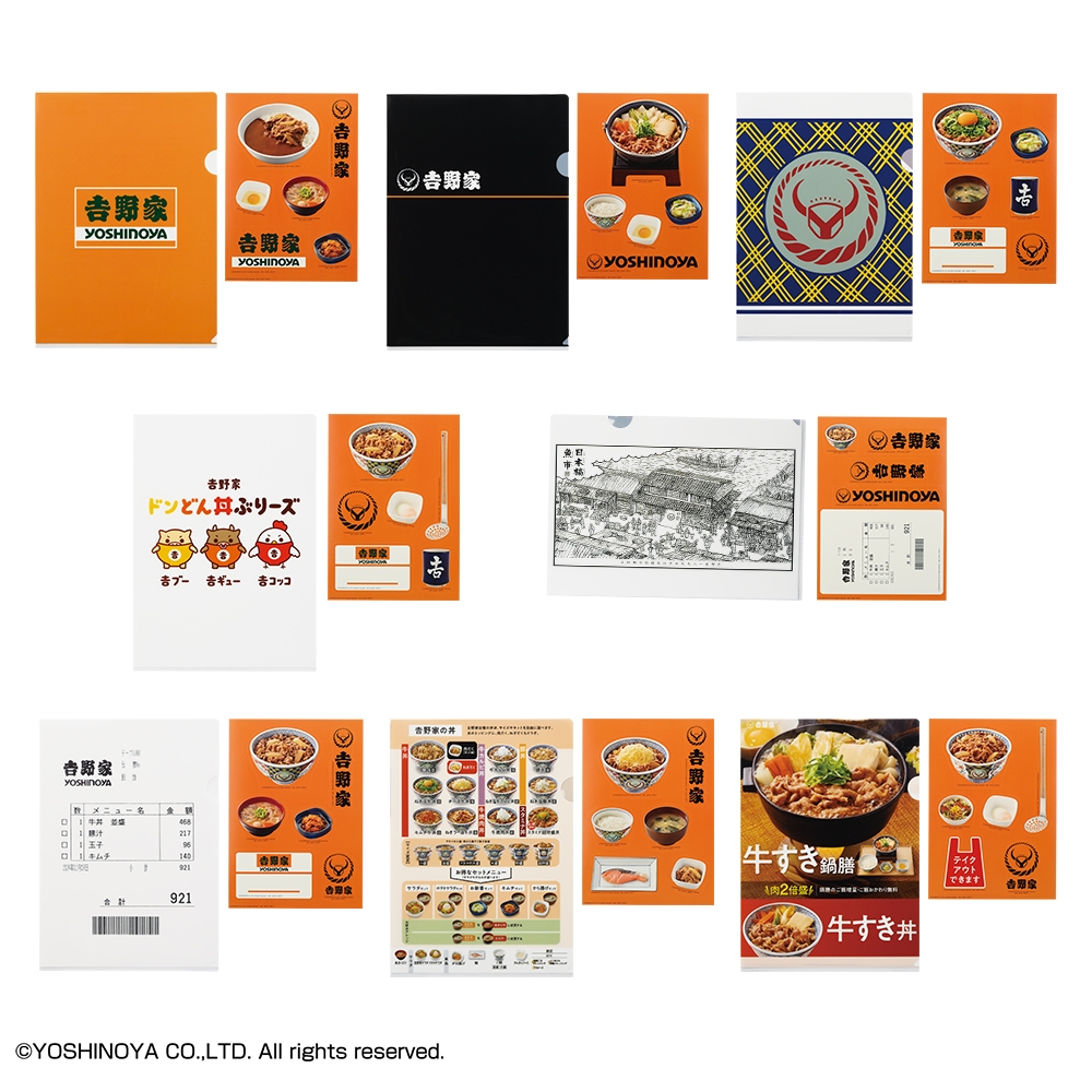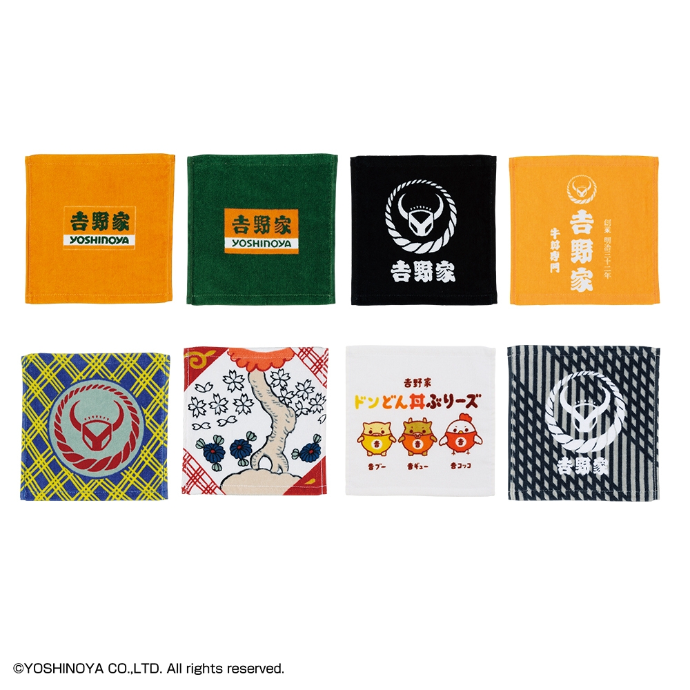このほか、一度は見たことのあるあのデザインモチーフの選べる全4種のエコバッグ、「湯呑」や「伝票」などお馴染みアイテムのユニークなポーチ全4種、吉野家ファン必見デザインの使いやすいサイズ感のタオル、メニューやアイテムなどのバラエティ豊かな絵柄を使用した「クリアファイル・ステッカーセット」と、いずれも吉野家の魅力がたっぷり詰まった一番くじならではの商品を取り揃えました。