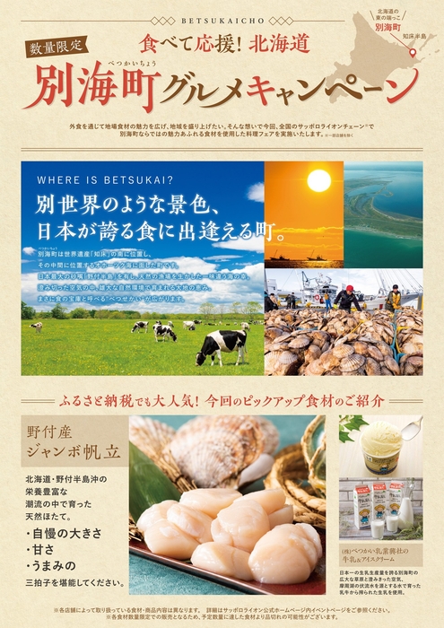 ・内容:別海町産の「ジャンボ帆立」や生乳生産量日本一の乳製品を使用した特別メニューをディナータイムに提供し、ホタテの国内消費を促進しています。