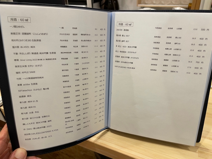 アルコールメニューも多彩で、和歌山のサワーエールから、店名にもなっている竹岡(千葉)まで、幅広いラインナップが揃っています。日本酒は60cc400円から楽しめ、店主のこだわりが至る所に見られます。