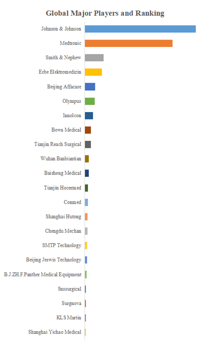 YHResearchのトップ企業研究センターによると、手術用エネルギー器具の世界的な主要製造業者には、Johnson & Johnson、Medtronic、Smith & Nephew、Erbe Elektromedizin、Beijing Affacare、Olympus、Bowa Medical、Innolcon、Tianjin Reach Surgical、Wuhan Banbiantianなどが含まれている。2023年、世界のトップ10企業は売上の観点から約65.0%の市場シェアを持っていた。