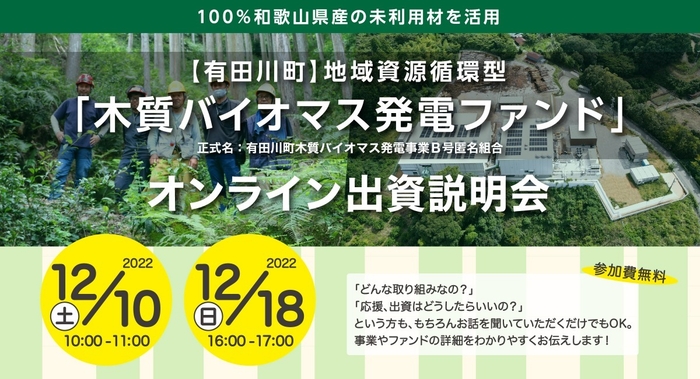 再生可能エネルギー事業の新たなファンド 100%和歌山県産の未利用材を活用する「有田川バイオマス発電所」 2022年12月10日、12月18日に説明会を実施。