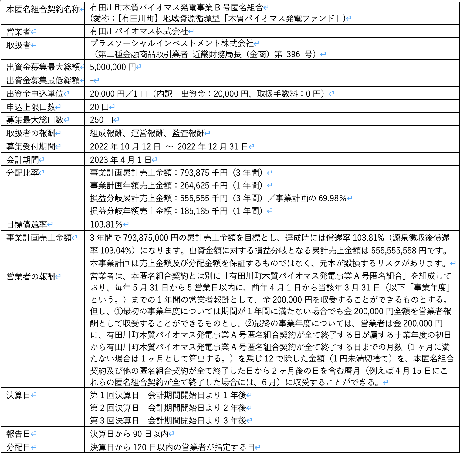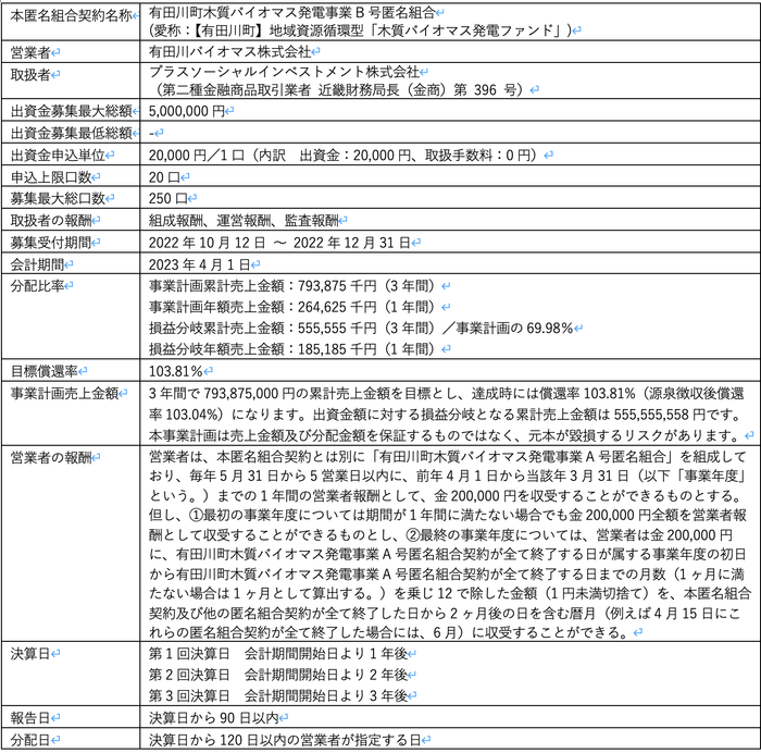 【有田川町木質バイオマス発電事業B号匿名組合の概要】