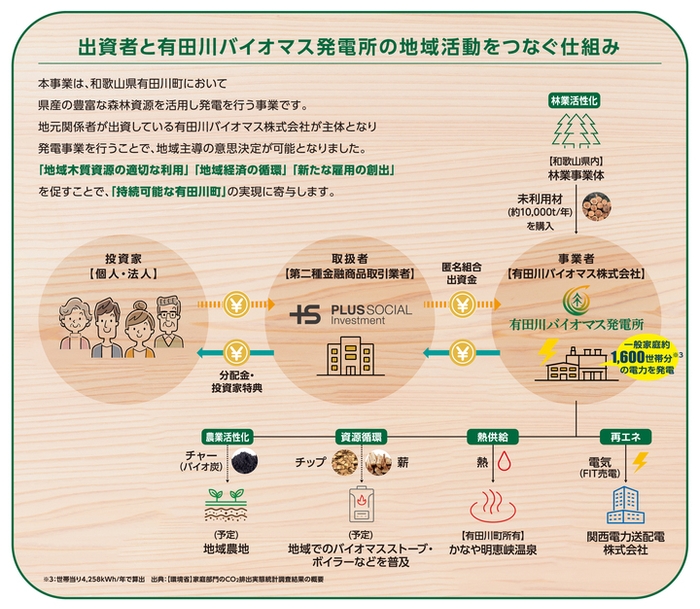 プラスソーシャルインベストメント株式会社(代表取締役社長 野池雅人、京都市上京区、以下PSI)は、有田川バイオマス株式会社(代表取締役 原見健也、和歌山県有田川町)を営業者とする「有田川町木質バイオマス発電事業B号匿名組合(愛称:【有田川町】地域資源循環型「木質バイオマス発電ファンド」)」募集総額500万円(1口金額2万円、会計期間3年)を組成し、2022年10月12日に投資型クラウドファンディングの手法を用いた、社会的投資プラットフォーム「en.tryエントライ」で募集を開始しました。