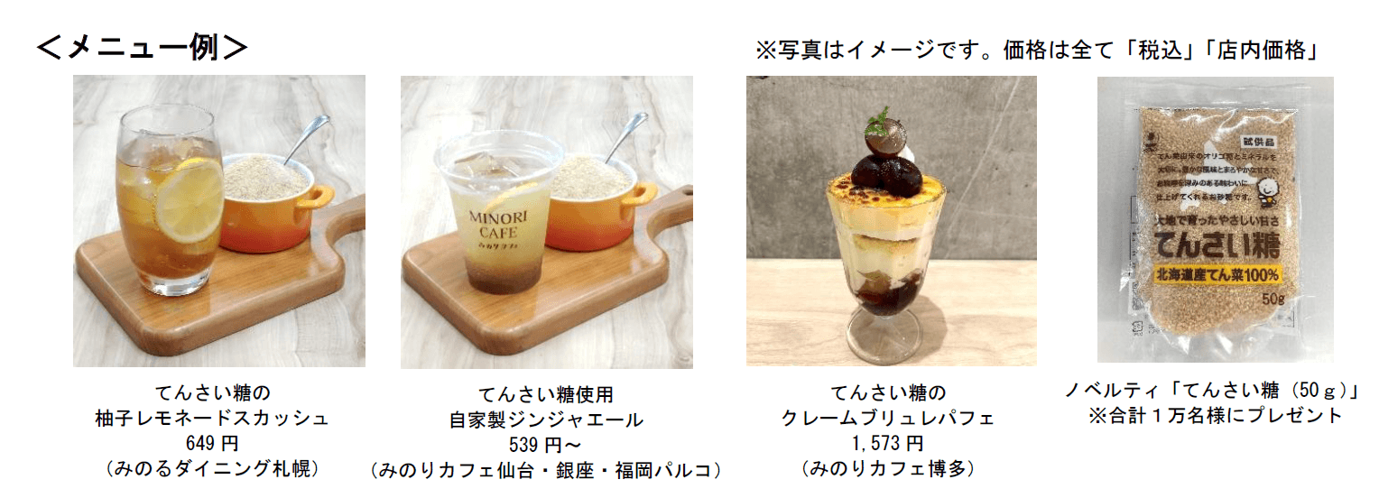 フェアでは、まろやかな甘さや上品な味わいが特長の「てんさい糖」を使用した限定メニューを各店舗で提供します。期間中、ご来店のお客様先着5店舗合計1万名にノベルティ「てんさい糖(50g)」をプレゼントします。「てんさい糖」は、JA全農が運営する産地直送通販サイトJAタウンの「ホクレン」ショップで購入できます。