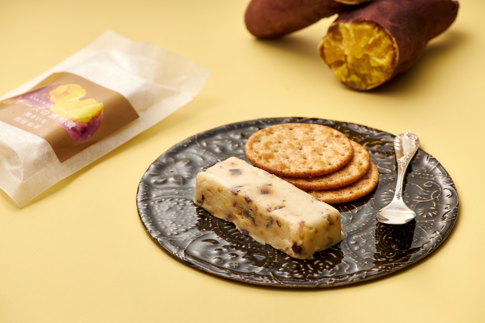 吟醸酒粕とみりん粕を合わせた特製粕床で漬け込んだ酒粕チーズに、甘味の強い紅天使の熟成芋をたっぷりゴロゴロと混ぜ込んでいます。