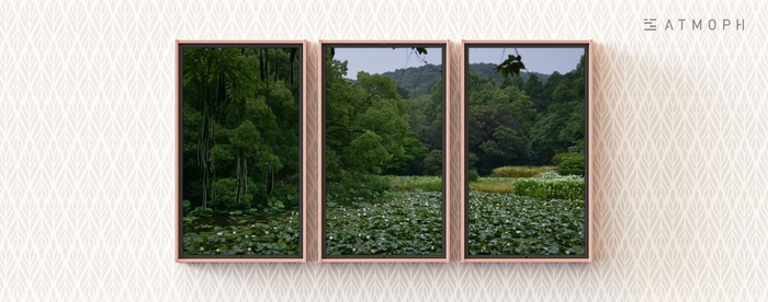 Atmoph Window 2では、窓をうつ雨の音や曇り空に映える色とりどりのアジサイがある風景などの風情ある風景を取り揃えています。さらに、本日は新しく今の時期にぴったりの「雨の氷室池」の風景が追加されました。