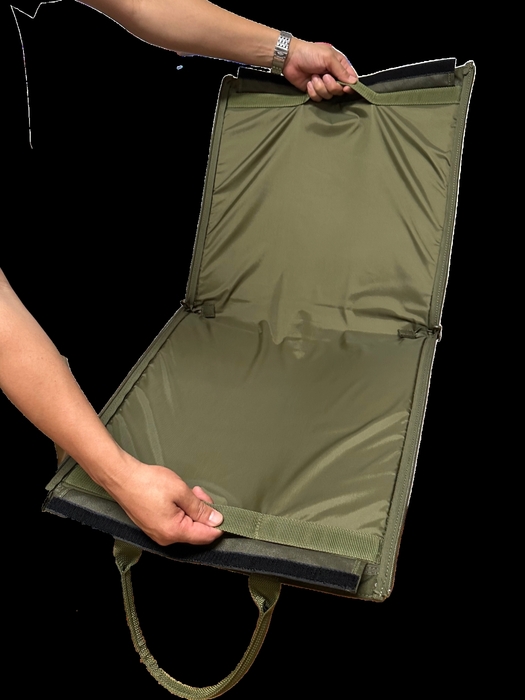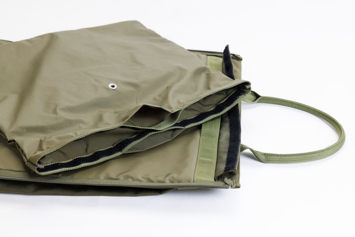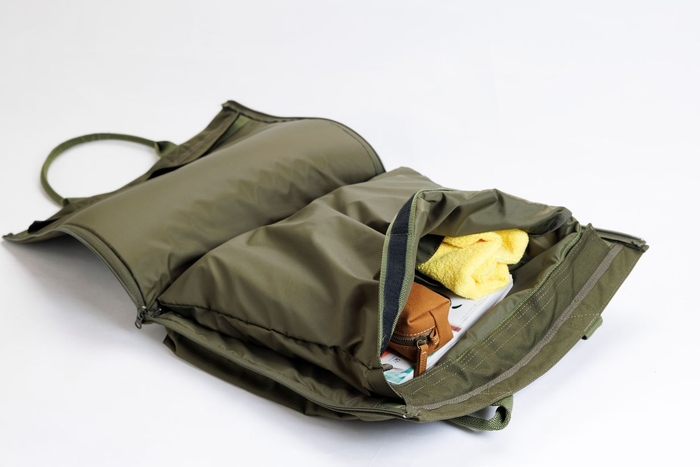 左右のファスナーを開けることでバッグを大きく広げ、二人で持つことで更に広い範囲を防御可能。