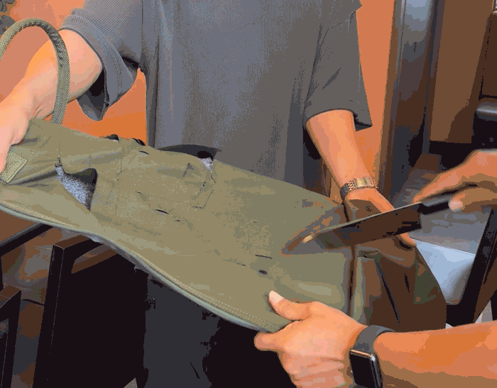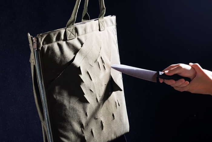 本商品は戦闘用に製造された物ではなく、万が一の時に身を守る助けになるよう作られた切れにくい生地のバッグです。絶対に切れないわけではないため、身の危険を感じた場合は命を守る為、逃げる行動を最優先してください。