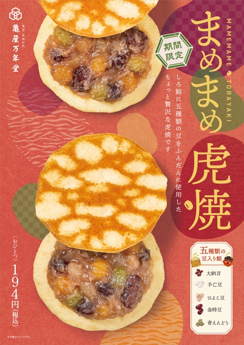 株式会社亀屋万年堂(本社・工場:神奈川県横浜市都筑区 / 総本店:東京都目黒区自由が丘)は、節分にちなみ5種類の豆を使用した、この時期だけの『まめまめ虎焼』( 1個194円(税込)・常温販売・季節限定 )を2024年1月11日(木)より、亀屋万年堂直販店舗(東京・神奈川26店舗)及び公式オンラインショップにて販売いたします。
