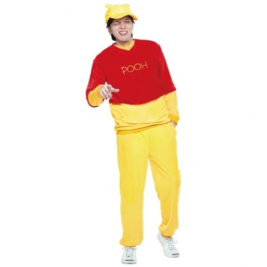 まずはプーさんのコスチュームを発見!ベロア風のやわらかな生地でできた、スウェットタイプのプーさんです。派手な赤と黄色で、イベントでも目立つこと間違いなしでしょう。