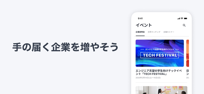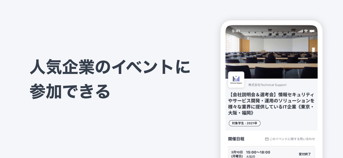 本アプリは、エンジニア・総合職・デザイナーの3種類の職種、地域、開催日程といった希望する項目に応じて、大手企業からベンチャー企業まで様々なフェーズの企業説明会や、企業の採用担当者との1on1面談などの合同マッチングイベント、業界研究のポイントや自己PRシートの書き方など、就職活動に欠かせない知識を学べるセミナーなどを簡単に探すことができ、そのまま申し込みすることができます。