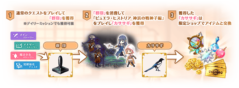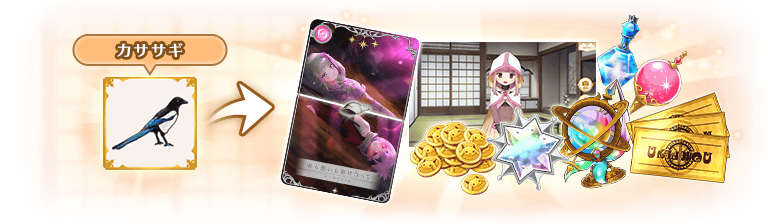 本イベントで獲得した「カササギ」は限定メモリア「血も想いも溶け合って」や限定ホーム背景「神浜の戦神子編」等、貴重なアイテムと交換できます。