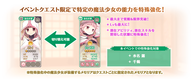 対象の魔法少女を編成して本イベントクエストをプレイする際にステータスを特殊な状態に強化することができます。