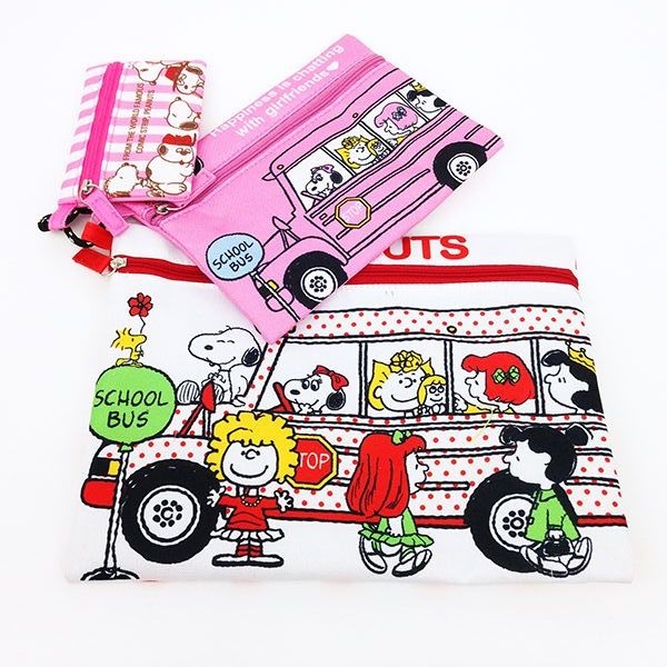 三つめは、ガールズスクールバスの3連ポーチです。大中小のサイズ違いのポーチなんです。柄もそれぞれにキュート♡ドット柄のバスもかわいいですよね。女の子たちの中に、なぜかちゃっかりスヌーピーが混じってます♪