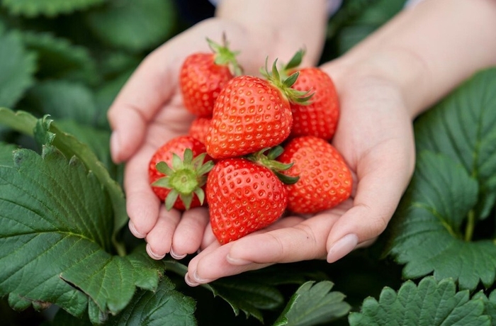 まずはやっぱりいちご狩り。1月中旬~5月下旬にかけて、村内各所でいちご狩りを楽しむことができます。大阪や京都からアクセスが良いのも魅力のひとつです。ハウスの中なので天気を気にせず満喫できるのもうれしいポイントです。採れたてならではのジューシーないちごをお楽しみいただけます。