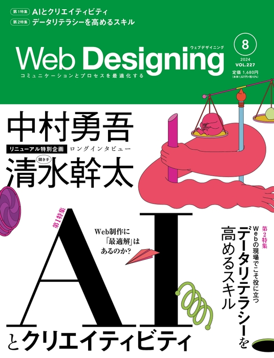 第1特集「AIとクリエイティビティ」、第2特集「データリテラシーを高めるスキル」といった読み応えたっぷりの記事に加え、Web Designingの歴史を語る上では欠かせないお二人による、リニューアル特別企画「ロングインタビュー:中村勇吾&清水幹太」や新連載をスタートしました。