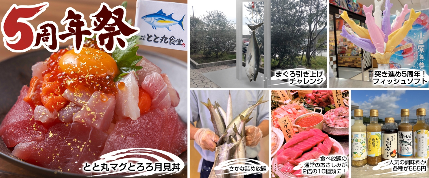 これまで支えていただいたお客様への5年間の感謝を込めて、「GoGo5周年祭」を5日間限定で開催します。1F 地場物産販売コーナーでは、5周年祭特別価格555円で人気調味料の販売やみかん詰め放題を実施。2F小田原漁港とと丸食堂では、5種類のまぐろの食べ方を楽しめる「まぐろ堪能祭り寿司」(限定10食)など、5周年祭特別メニュー3種類を販売。3Fおさしみ天国・小田原海鮮ゴーゴー!!では通常の2倍のおさしみ10種類がすべて食べ放題に!