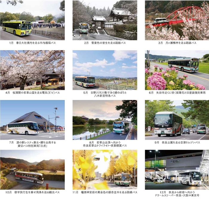 当カレンダーでは、当社バスの走る沿線風景をバス専門誌等のカメラマンとして活躍する伊藤岳志(いとうたけし)氏の写真で紹介いたします。今回は、新しく導入した「電気(EV)バス」や「ドリームスリーパー奈良・大阪⇔東京号」の写真を使用しているほか、奈良県各地の名所をバスとともに楽しんでいただける内容となっていますので、ぜひお買い求めください。