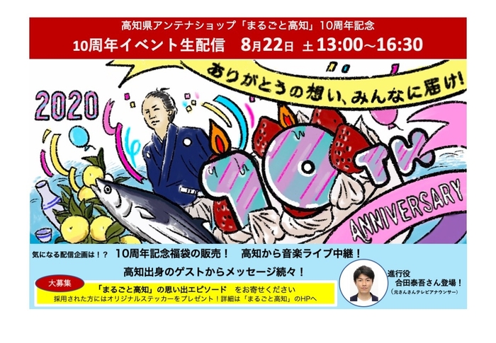 高知県アンテナショップ「まるごと高知」(運営:一般財団法人高知県地産外商公社)は、2020年8月21日に10周年を迎えるのを記念し、10周年記念イベントを生配信いたします。