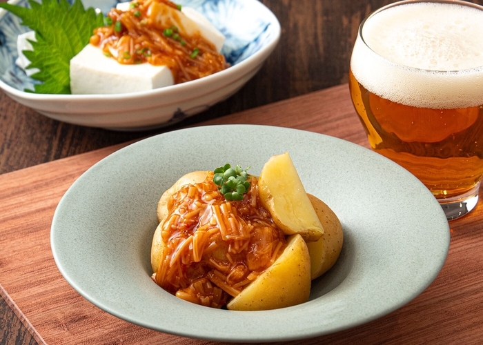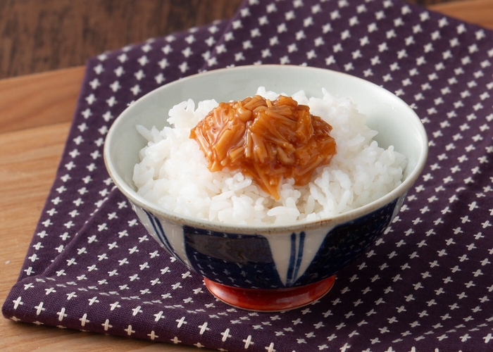 えのきのジャキジャキとした食感が美味しい「明太なめたけ」です。ピリッと辛いやまやの明太子と調味液を合わせ、旨辛に仕上げました。キムチ風味でご飯に合う一品です。白いご飯はもちろん、そうめんや冷ややっこなどのアレンジなどにも活用いただけます。
