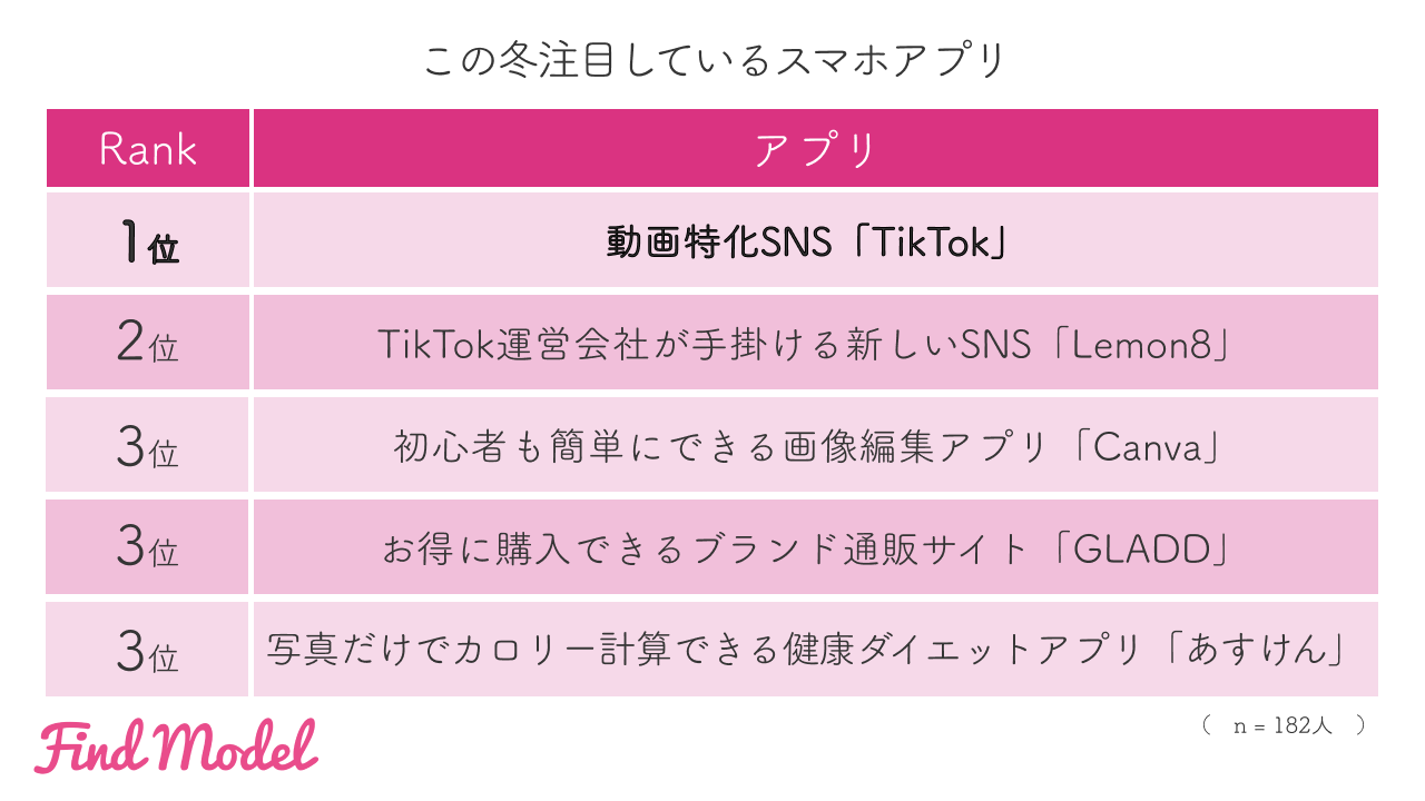 この冬インスタグラマーが注目しているスマホアプリ1位は短尺の動画を作成・投稿できるSNSプラットフォーム【TikTok】となりました。
