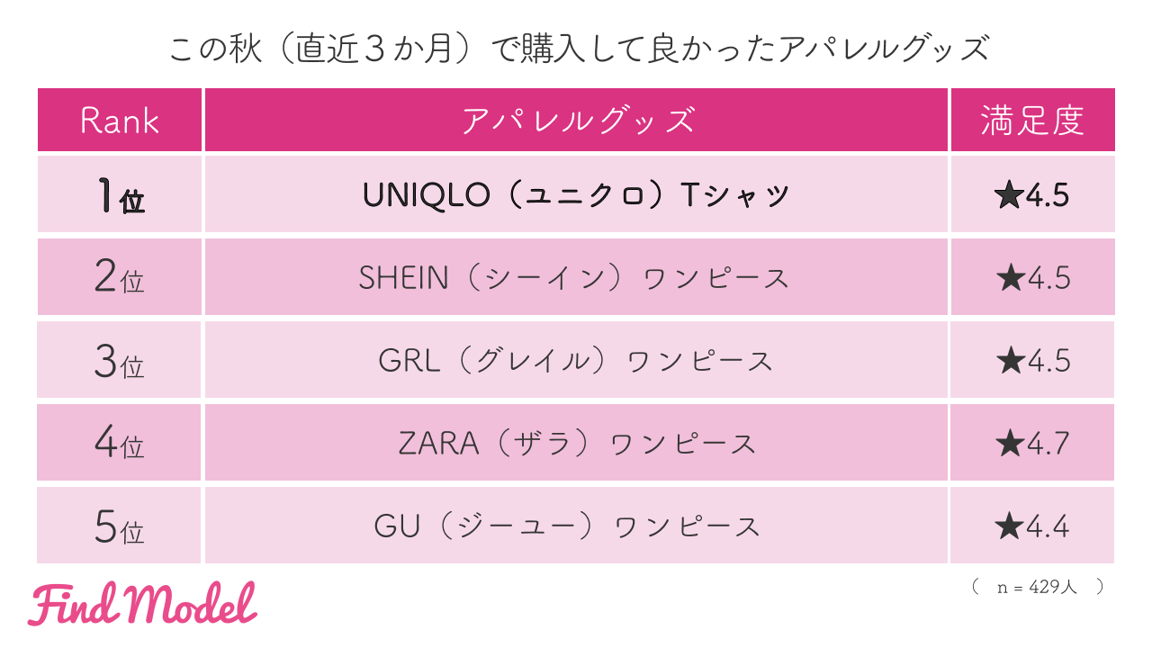 この秋インスタグラマーが購入して良かったアパレルグッズは【UNIQLO(ユニクロ)Tシャツ】が1位となり、2位に【SHEIN(シーイン)ワンピース】がランクインしました。【UNIQLO(ユニクロ)Tシャツ】は前回のアンケートにて2位でしたのでランクアップしています。