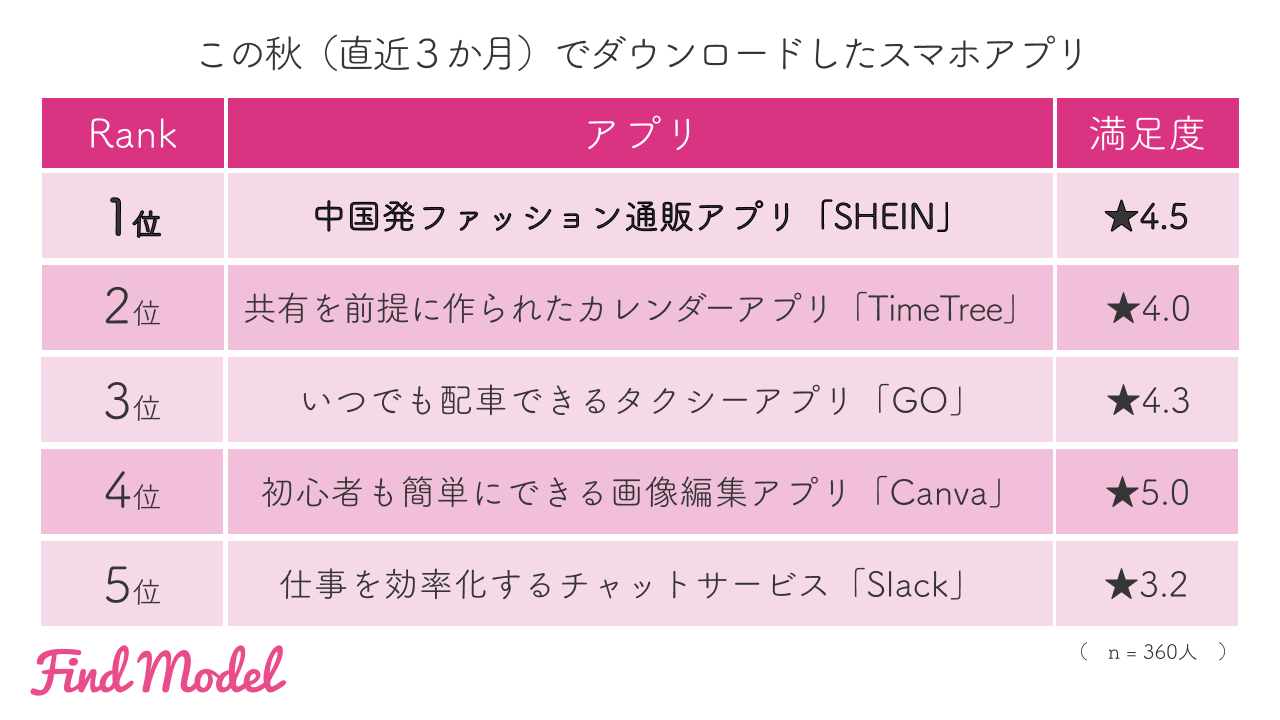 この秋インスタグラマーがダウンロードしたスマホアプリ1位は前回のアンケートと同じく中国発ファッション通販アプリ【SHEIN(シーイン)】となりました。