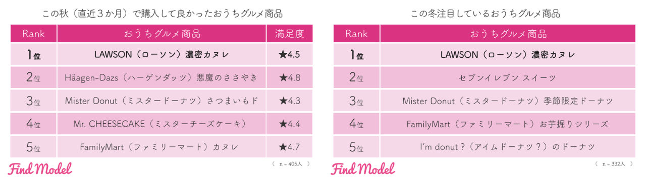 この秋インスタグラマーが購入して良かったおうちグルメは【LAWSON(ローソン)濃密カヌレ】が1位となり、2位に【Haagen-Dazs(ハーゲンダッツ)悪魔のささやき】、3位に【Mister Donut(ミスタードーナツ)さつまいもド】となりました。