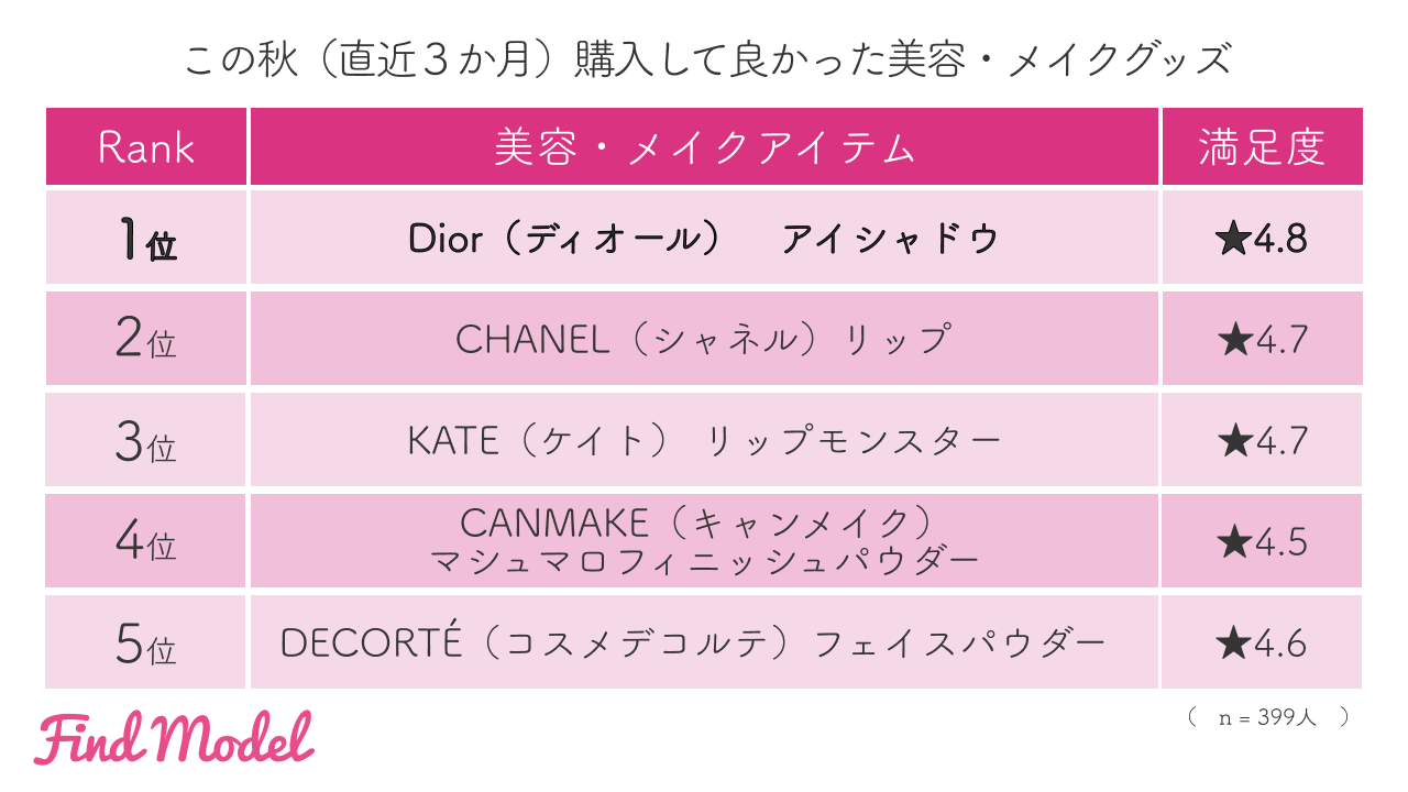 この秋インスタグラマーに購入された美容・コスメアイテムは【 Dior(ディオール)アイシャドウ】となり、過去2回のアンケートに続き連続で1位はDiorでした。今回中でも人気だったのはアイシャドウでした。満足度も5点満点中4.8点と高い結果となりました。使用した感想としては「発色がとても良かった。パッケージも高級感があって好きです。(30代女性・1.1万フォロワー)」「使いやすい色が揃ってる(40代女性・3.7万フォロワー)」と、見た目の可愛さ、秋カラーという色味や発色を推す声が多く見られました。