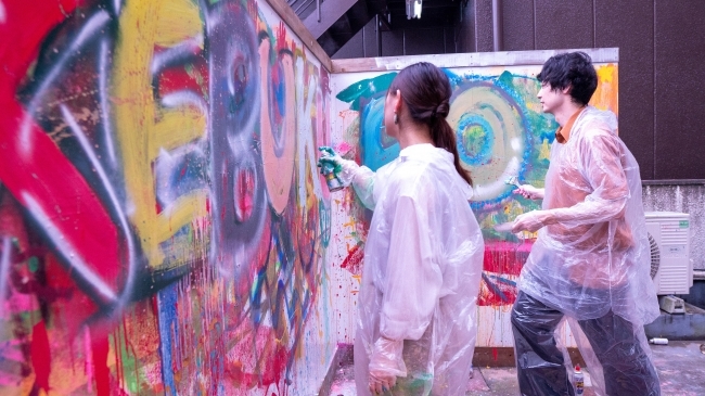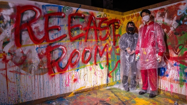 3つのREEAST ROOM独自コンテンツは、どれも圧倒的な非日常を体験することができますが、その中でも、ビルに落書きし放題"FREE ART WALL"では、屋外屋上にある高さ2mほどの壁と屋上に通ずる階段に直接、絵の具とスプレーを使用して落書きができ、大人も子供も夢中になって楽しめるコンテンツとなっています。