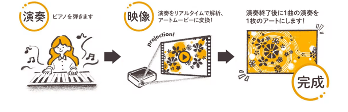 電子ピアノで弾いたメロディが、世界に一つだけのアートムービーとオリジナルの画像 として形になります。アートムービーとオリジナルの画像は大型スクリーンでお楽しみいただけます。