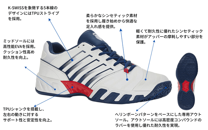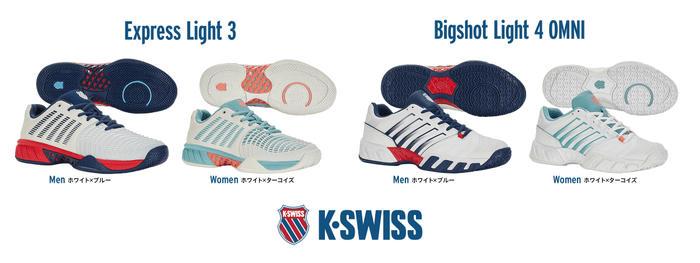 「K-SWISS」は1966年に世界で初めてオールレザーのテニスシューズを発売したカリフォルニア生まれのテニスシューズブランドです。現在ではATP、WTAツアー※で活躍するトッププレーヤーのフットワークをサポートしています。今回日本で販売するテニスシューズは、フィット感や快適性、サポート性を重視した軽量モデルで、初級者から上級者まで幅広い層のプレーヤーにご使用いただけます。