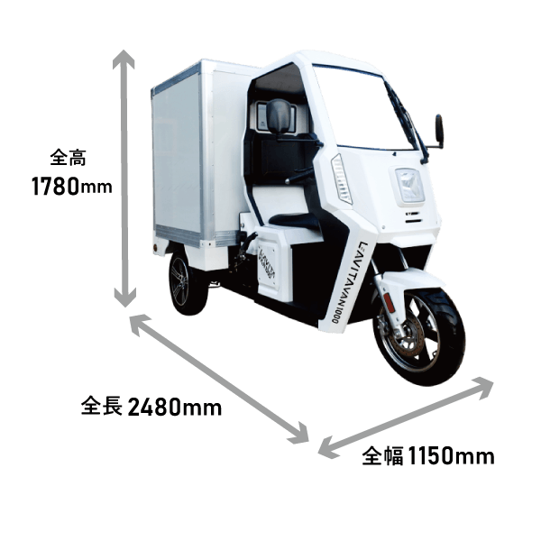 Shaeroの「デリバリートライク」は、幅115cm、全長248cmとコンパクトなサイズでありながら、1,000Lの荷室を持つ配送用の小型EVです。車両登録はミニカーで、最大積載量は90kg、最高速度は45km/hとラストワンマイルの配送ニーズや、個人的な荷物の運搬のニーズなどに最適な車両です。満充電走行距離は60km(リチウムモデルでは120km)。100円の電気代で約100km程度の走行が可能となっており、CO2の排出を抑え物流分野での環境負荷低減に貢献できる車両となっております。